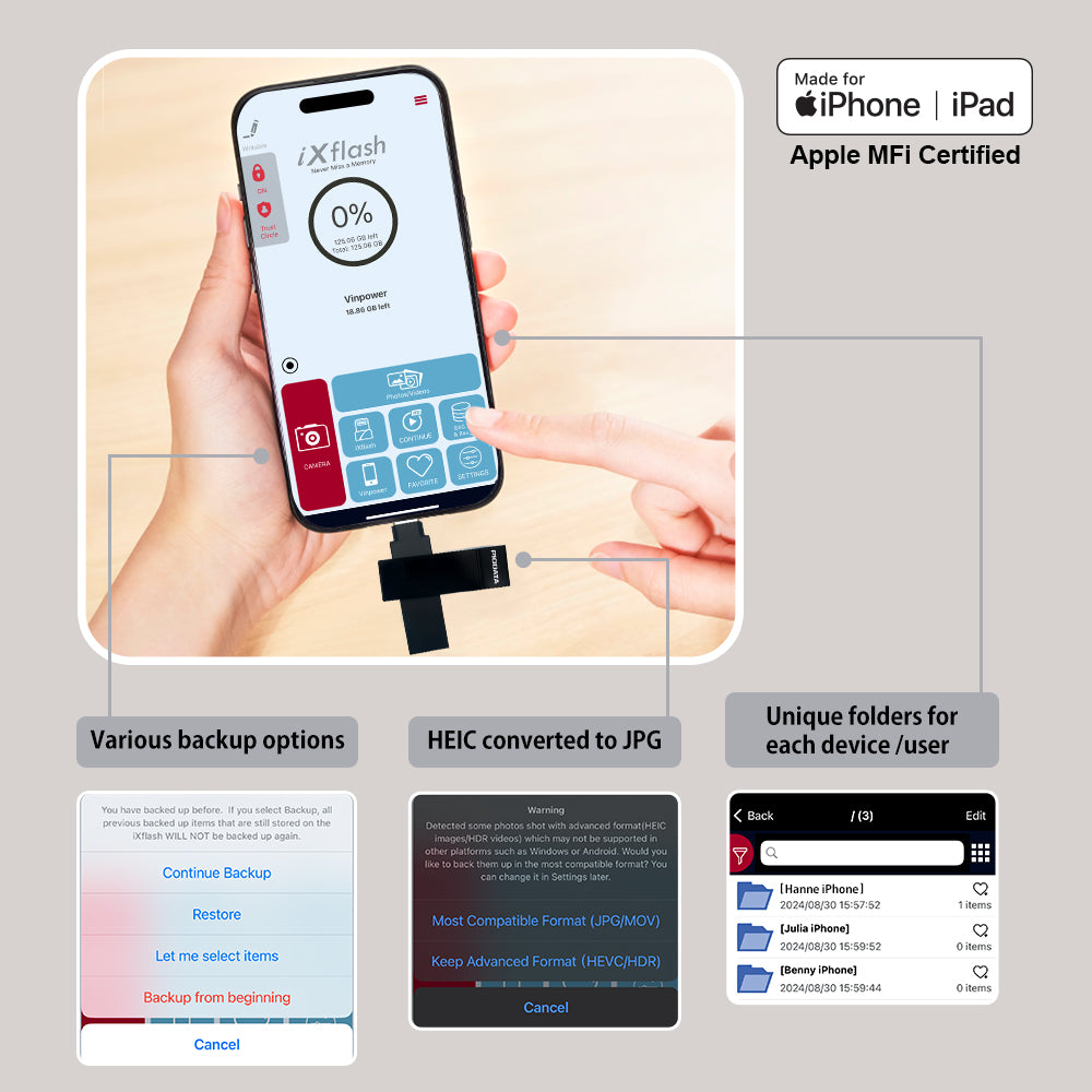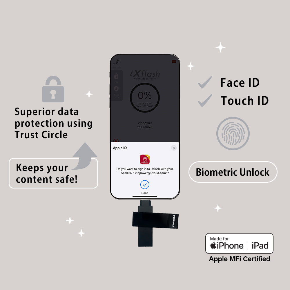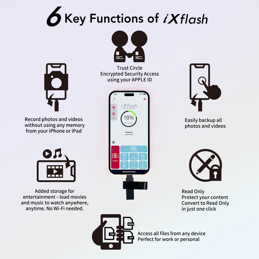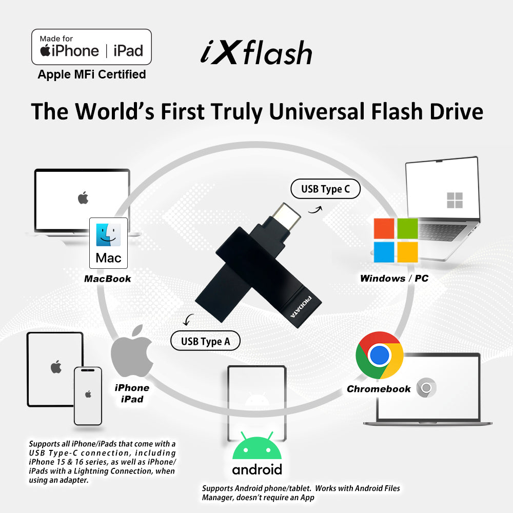 The PioData iXflash 128GB USB 3.2 Gen1 Black flash drive is Apple MFi-certified and designed for business users, students, and frequent travelers who need secure, reliable iPhone and iPad storage. It’s the first MFi-certified drive without a Lightning connector, fully compliant with Apple’s iOS protocol.