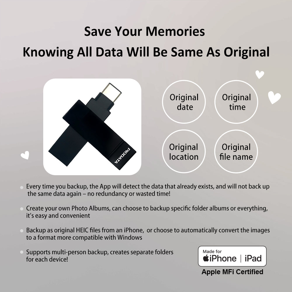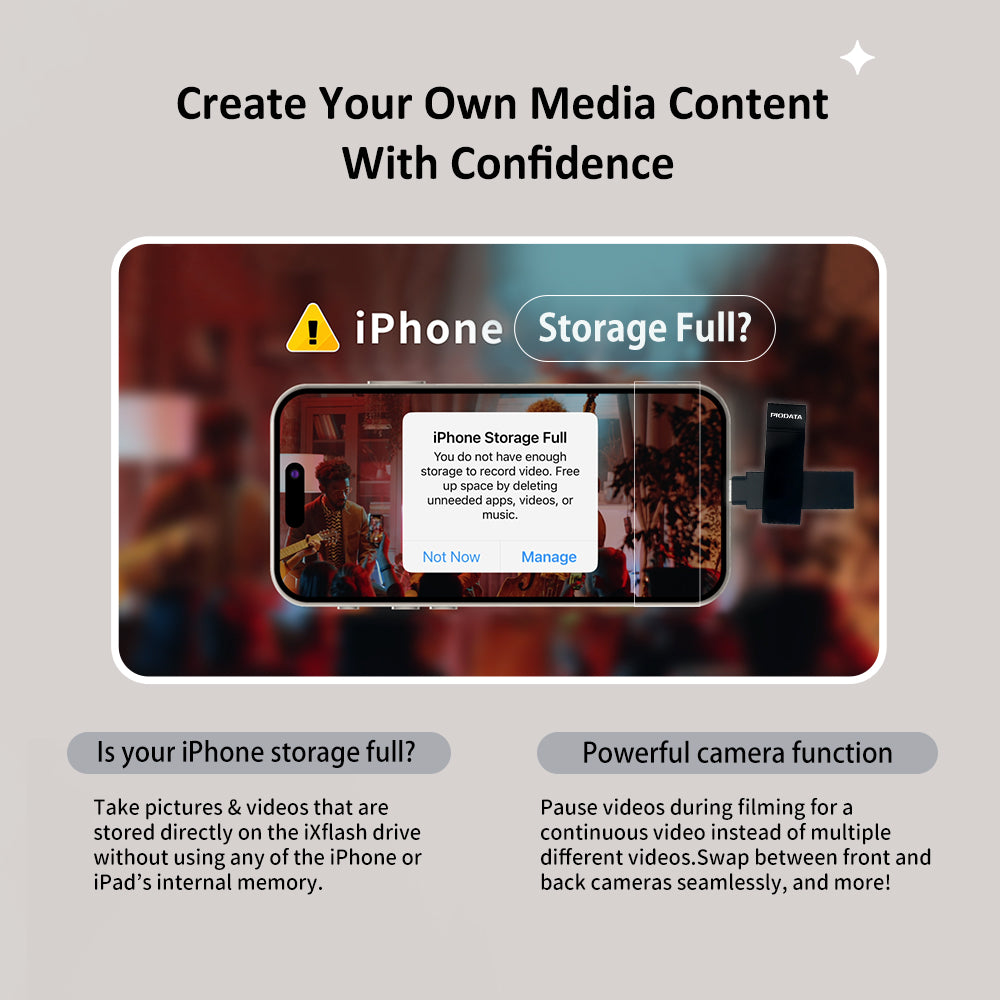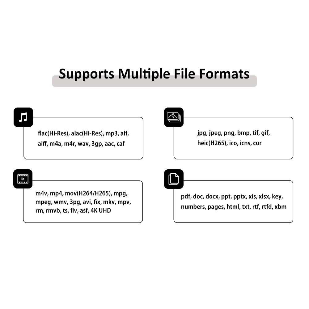 Dual USB-A and USB-C connectors enable fast backup, transfer, and storage of photos, videos, and documents across iPhone, iPad, Mac, PC, and Android devices. Record photos and videos directly to the drive to free up device storage. Supports 4K Ultra HD video and Hi-Res audio formats like FLAC.