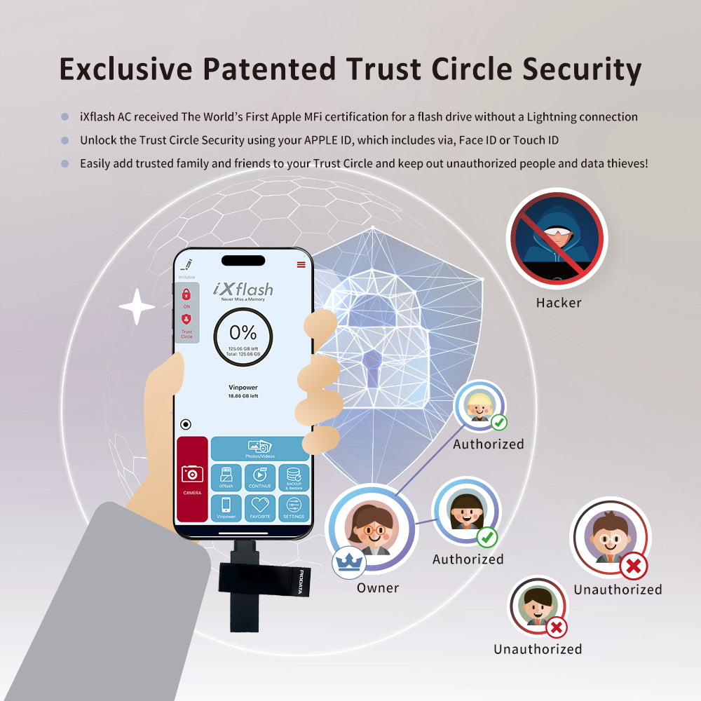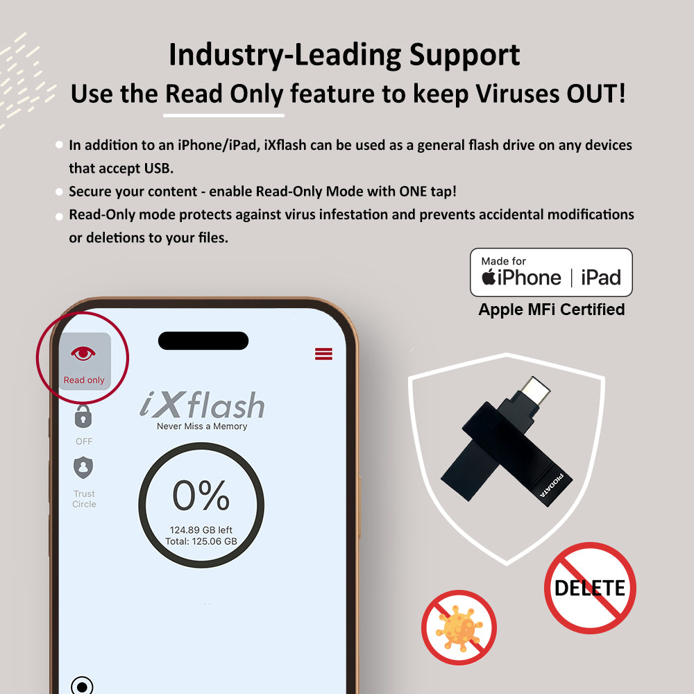 True 128GB capacity is protected with Trust Circle AES-256 encryption, Apple ID/Face ID/Touch ID authorization, and Read-Only mode. The durable black design fits most cases and works with the latest iOS plus the prior two versions. Streaming app downloads are not supported.