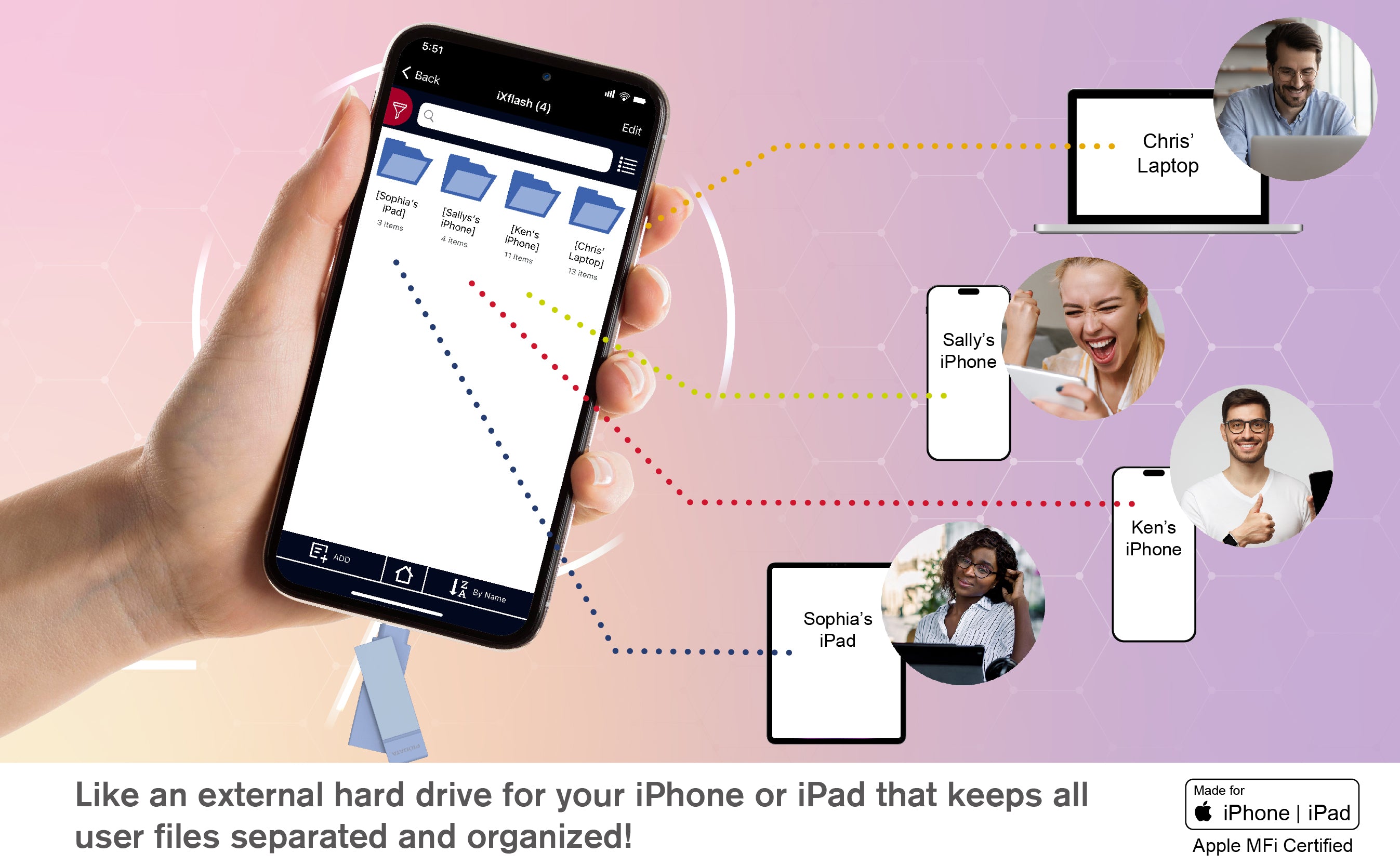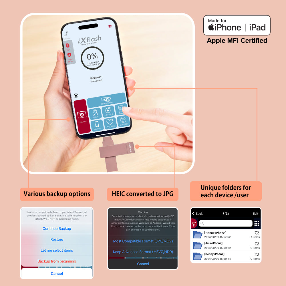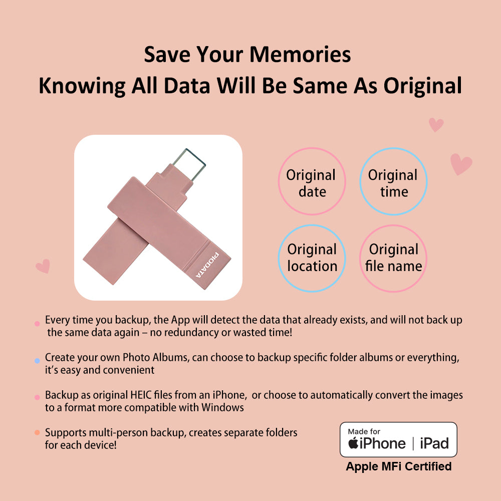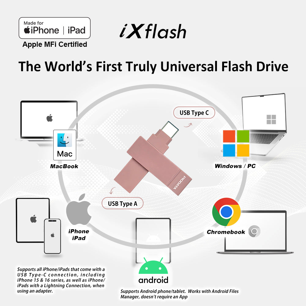 The PioData iXflash 128GB USB 3.2 Gen1 Flash Drive – Pink Edition blends stylish design with powerful performance, created especially for women, teen girls, and on-the-go creators who want reliable iPhone storage with a fashionable touch. It is the world’s first Apple MFi-certified iPhone and iPad flash drive without a Lightning connector, built to follow Apple’s official iOS protocol.