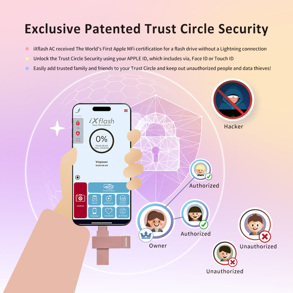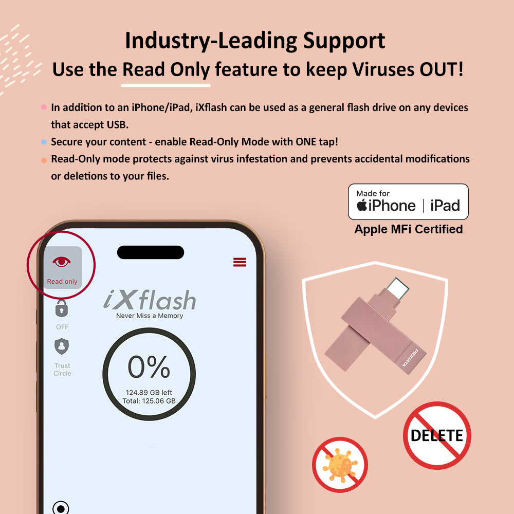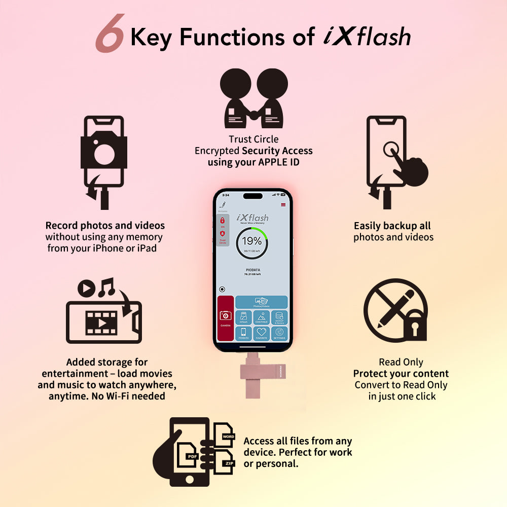 Designed with security in mind, the iXflash offers true 128GB capacity, Trust Circle AES-256 encryption, Apple ID, Face ID, or Touch ID access, and Read-Only mode to prevent accidental deletion and virus risks. The slim pink design fits most protective cases and supports the latest iOS and the prior two versions. Streaming app downloads are not supported.