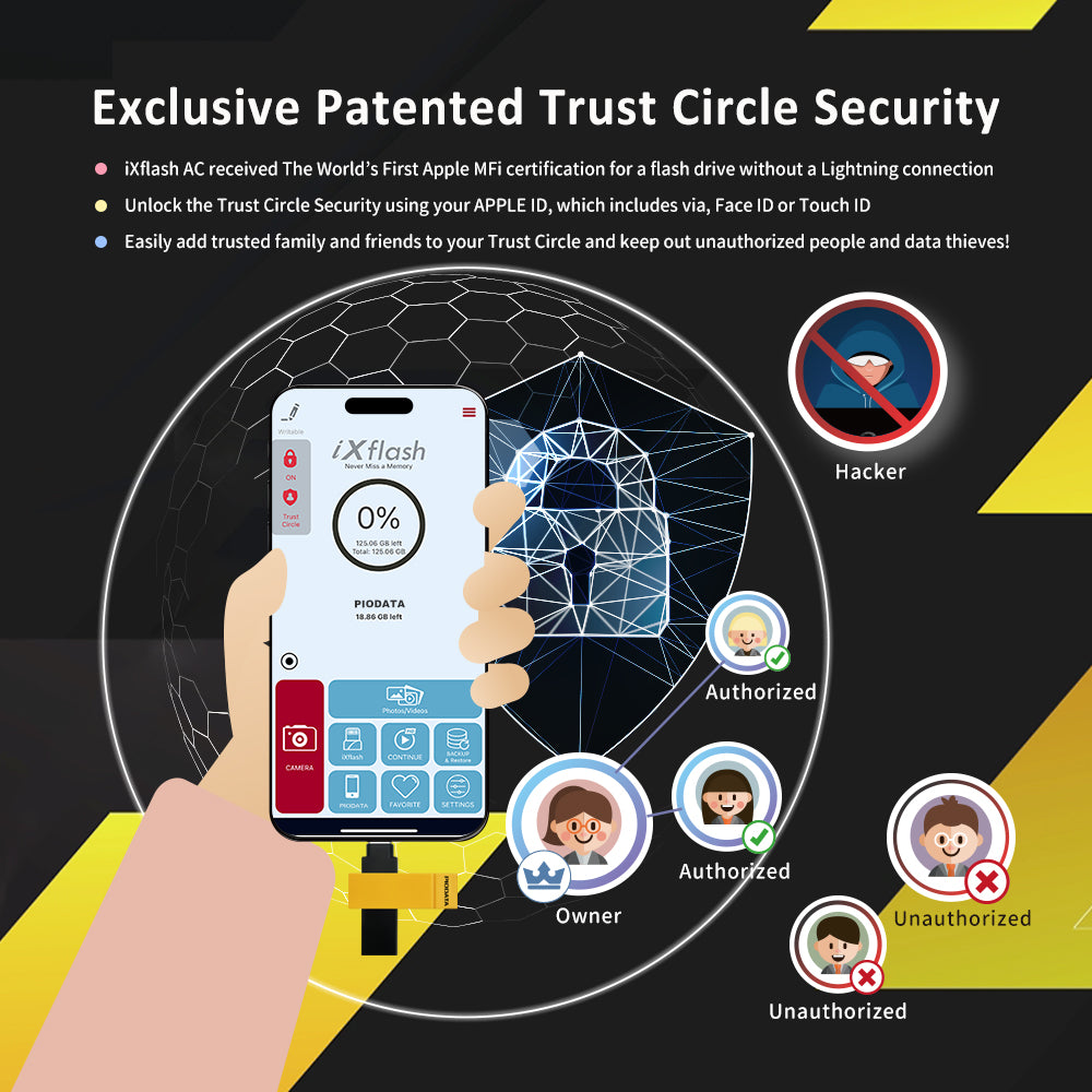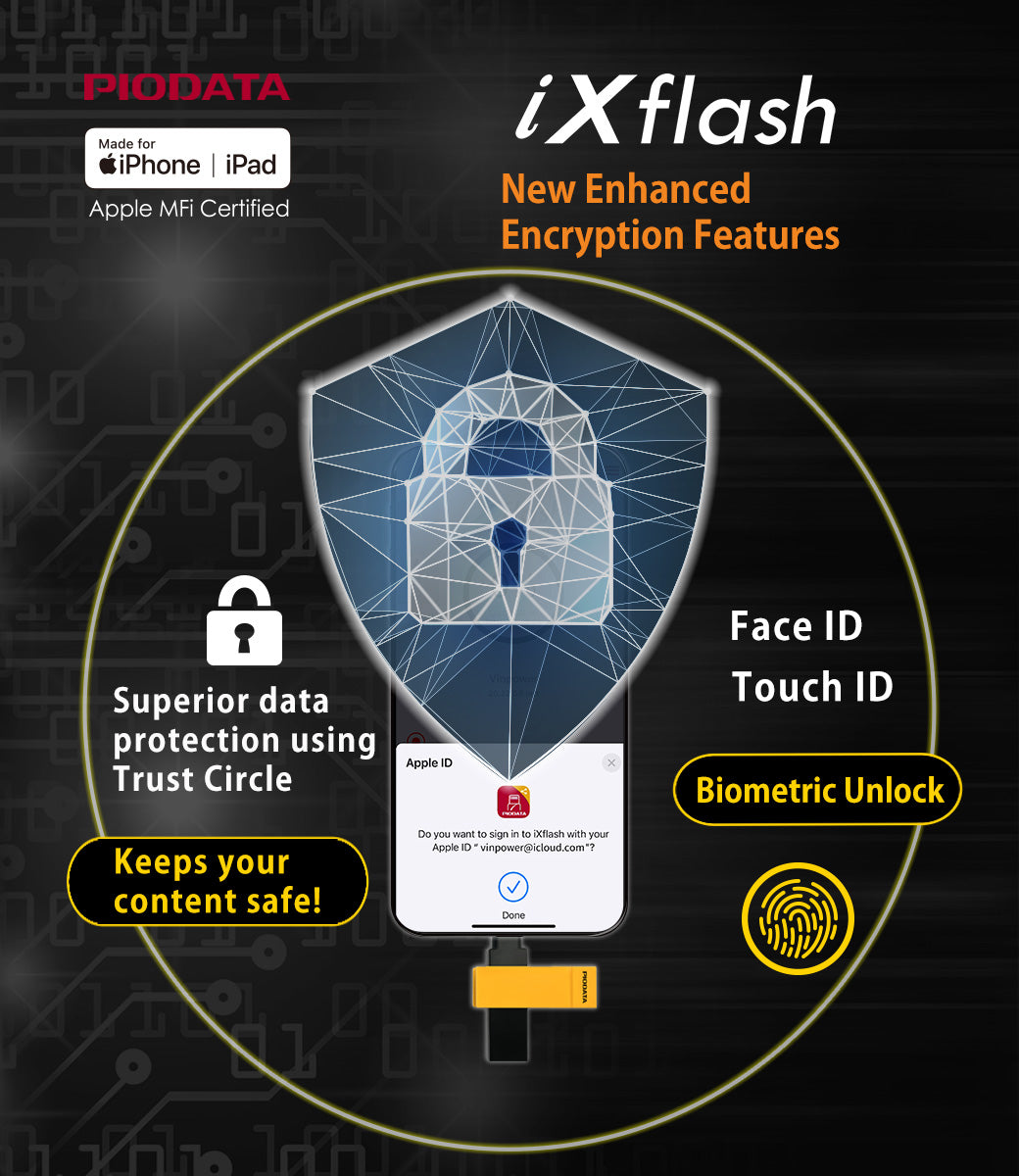 The iXflash supports 4K video playback and Hi-Res audio formats like FLAC and WAV for media lovers. With true memory capacity, Trust Circle AES-256 encryption, Apple ID, Face ID, fingerprint access, and Read-Only mode, your data stays secure. The slim Black/Yellow design fits most protective cases and supports the latest iOS and the prior two versions. Streaming app downloads are not supported.