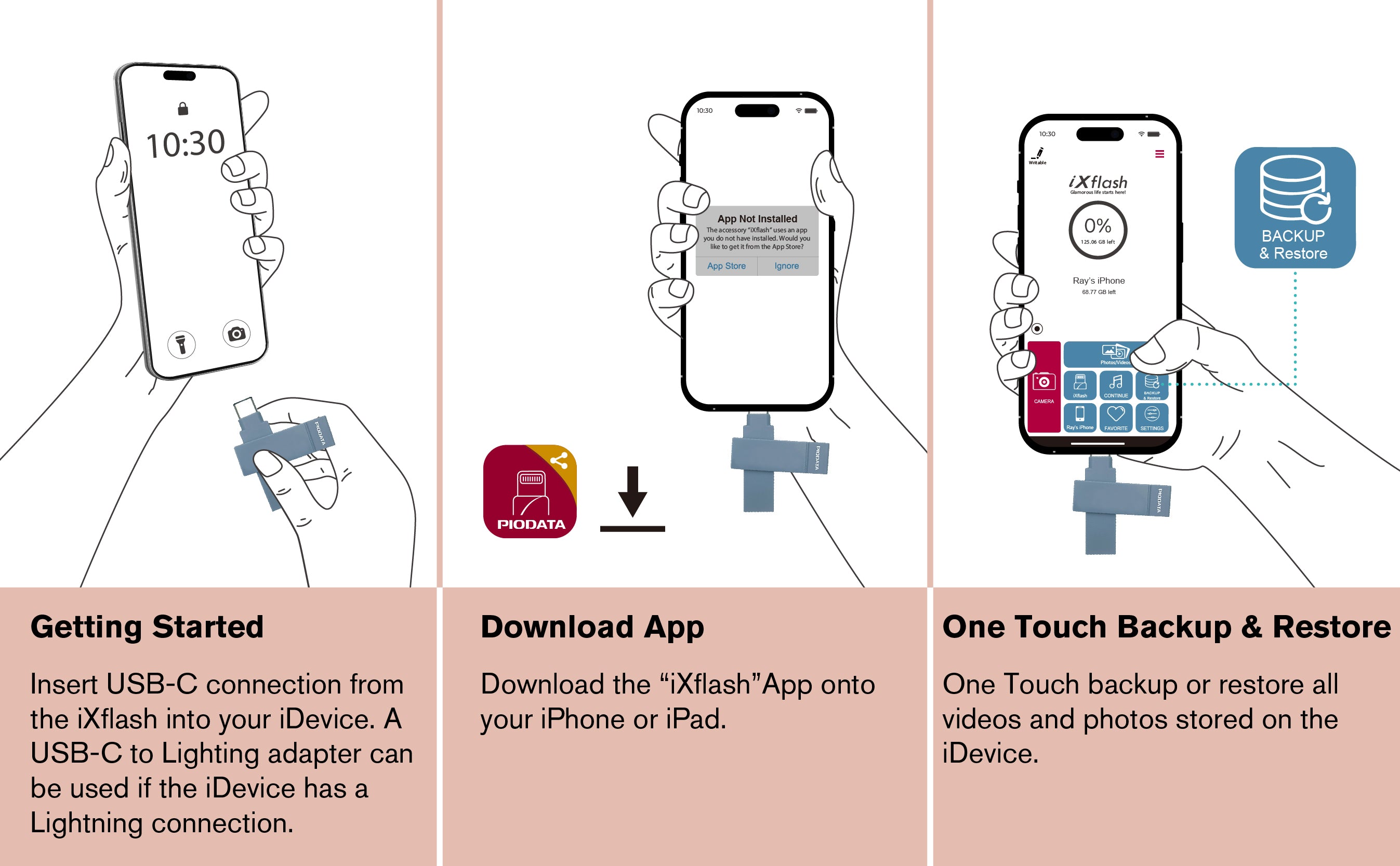 Featuring dual USB-A and USB-C connectors, the iXflash works seamlessly with iPhone, iPad, Android, Mac, PC, and other USB devices. Easily back up, restore, and transfer photos, videos, and documents, or capture photos and videos directly to the flash drive to instantly free up phone storage.