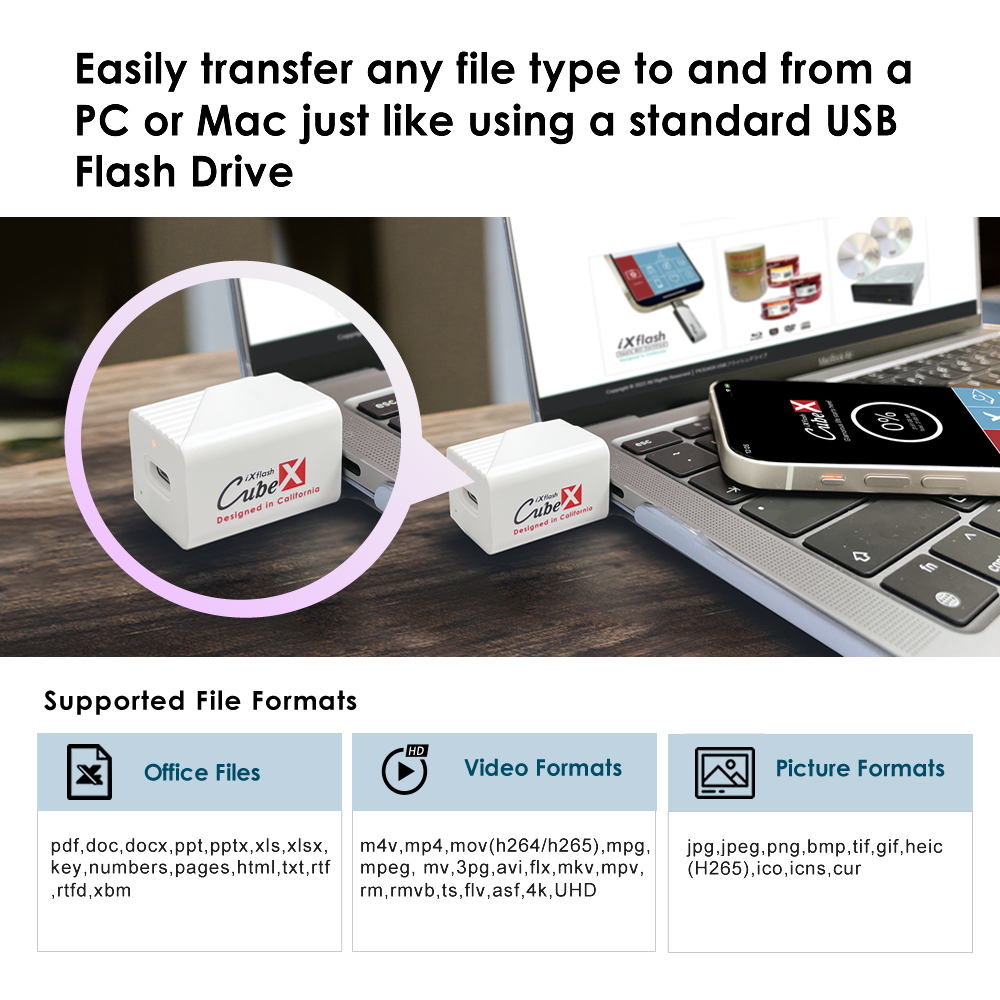 Simply connect the iXflash Cube and launch the free iXflash Cube app to perform automatic photo backup for iPhone and iPad. When connected to Wi-Fi, it can also back up iCloud photos, helping prevent storage-full issues and data loss. Files can be transferred to a PC, Mac, or any USB-C compatible device for flexible file management.