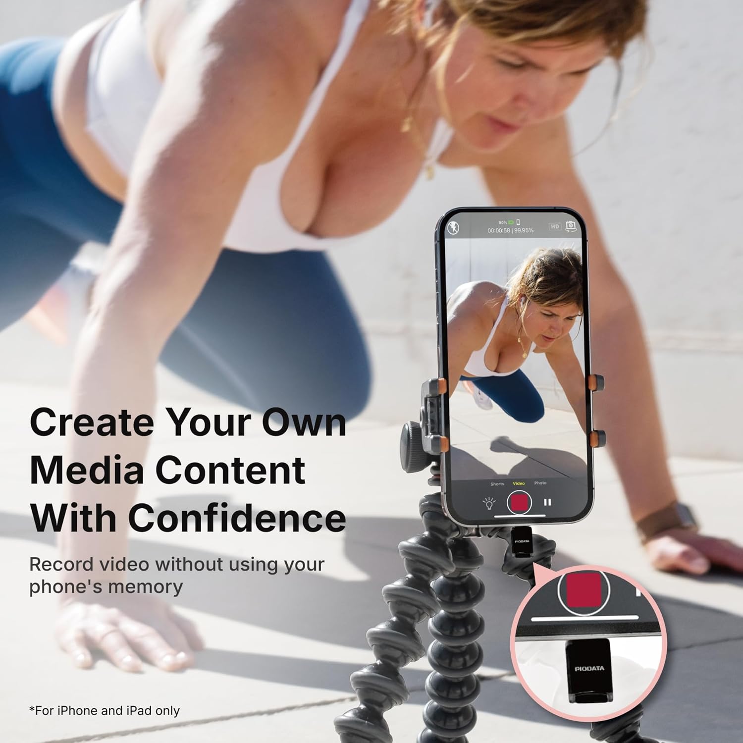 No app is required for basic use, but the free iXflash app (iOS) or PioData app (Android) enables automatic backup of photos, videos, contacts, and iCloud content when connected to Wi-Fi. You can also record photos and videos directly to the drive, freeing up device storage instantly.