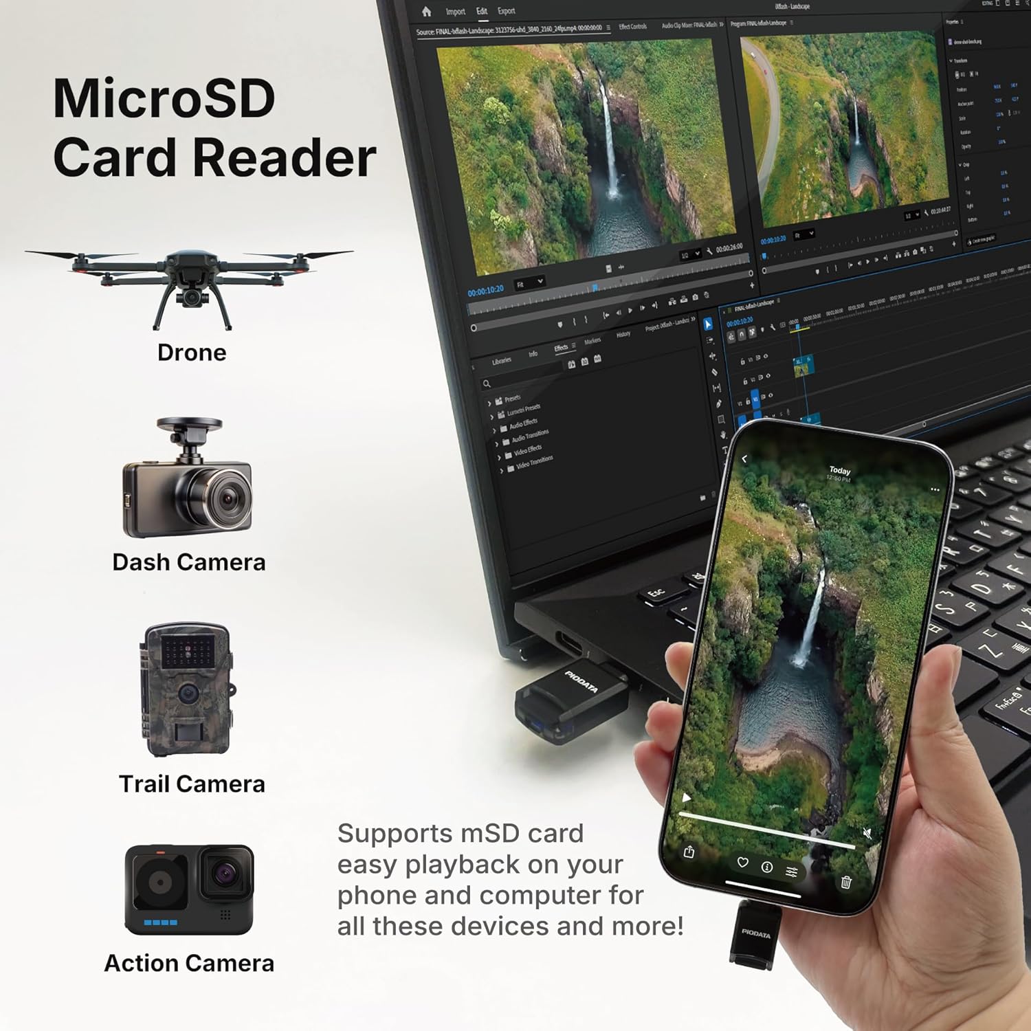 Supporting 4K video playback, Hi-Res audio (FLAC, WAV), and documents like Word, Excel, PowerPoint, and PDF, it also allows password-protected ZIP files. The iXflash Q mini doubles as a MicroSD card reader for drones and cameras. Apple MFi certified, it supports the latest iOS and fits most protective cases.